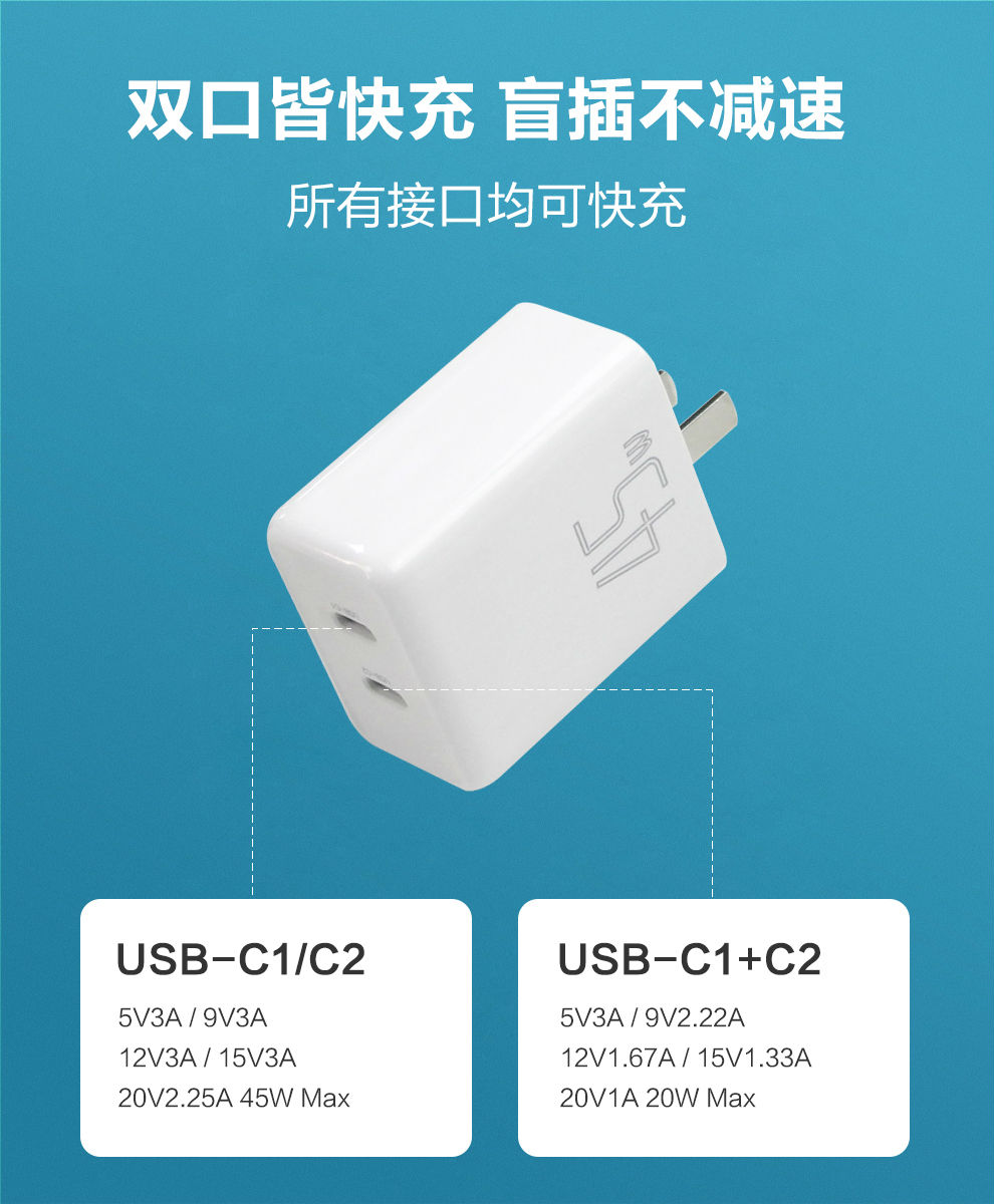 Type輸出:C1/C2: 5V3A/ 9V3A/ 12V3A/ 15V3A/ 20V2.25A 45W Max