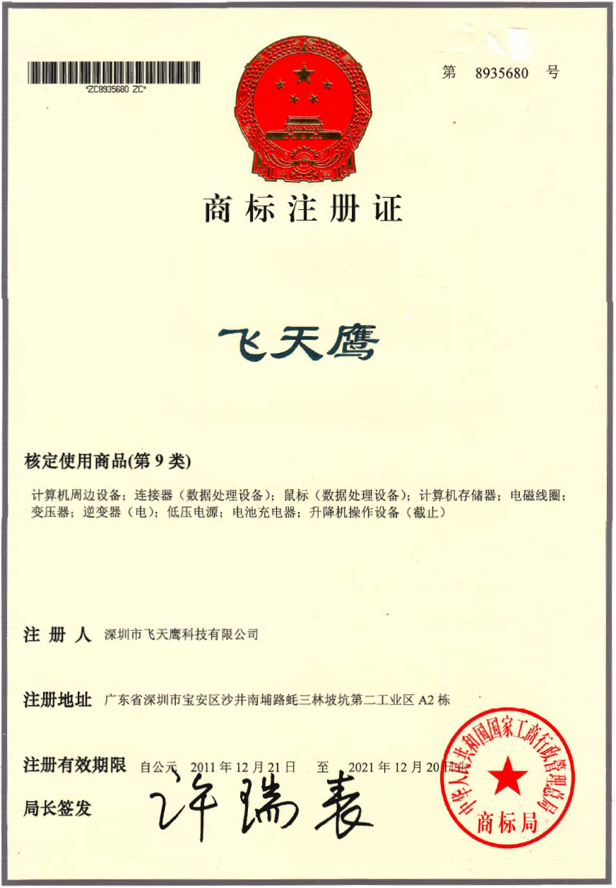 飛天鷹商標(biāo)證書(shū)