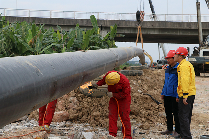 但水鄉(xiāng)片區(qū)地下水位高,地質(zhì)松軟,給敷設(shè)工程帶來了不小的困難。“挖好的管道溝還沒來得及放下鋼管就被下沉的淤泥覆蓋了,我們只能邊挖邊用鋼板在兩側(cè)加固,管道才能順利敷設(shè)。”東莞新奧工程技術(shù)管理部相關(guān)負(fù)責(zé)人介紹,整個項(xiàng)目全長14公里,3次橫穿公路,5次穿越河涌。為了減少對地貌和交通的影響,工程組靈活使用定向鉆穿越、頂管及直埋敷設(shè)施工方法。